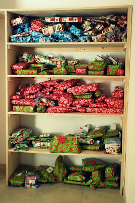 While our Christmas celebration was simple and sweet, their Christmas celebration would be wildly extravagant. We wanted to overwhelm these families with the love of God. I think we succeeded... but more about that later. If you notice the picture below has gifts on 5 different shelves. Each shelf represents a different family. My family is the top shelf.